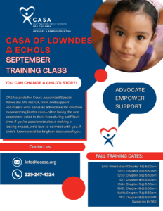 CASA of Lowndes & Echols Counties is recruiting volunteers for our Fall 2026 CASA Training Class. CASA volunteers serve as advocates for children experiencing foster care, helping ensure their voices are heard in court and throughout the child welfare system.